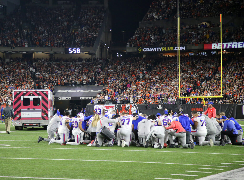 Photo of Buffalo Bills players kneeling to pray as an ambulance carries Damar Hamlin by Joseph Maiorana-Imagn.com, LLC.