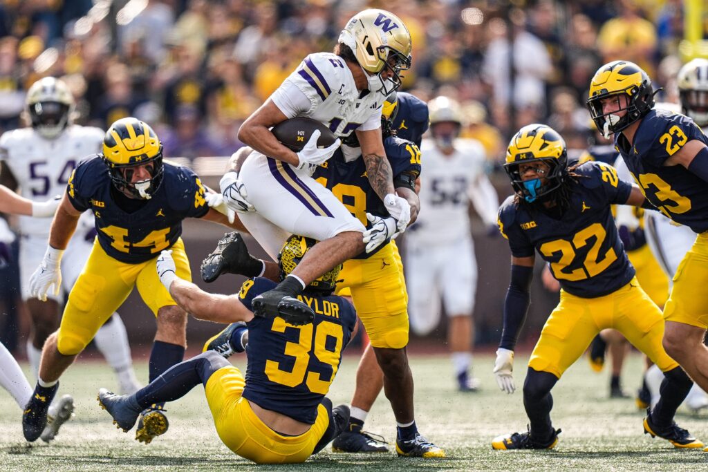 University of Washington wide receiver Denzel Boston (12) runs with the ball vs. Michigan. by Junfu Han-Imagn.com, LLC.