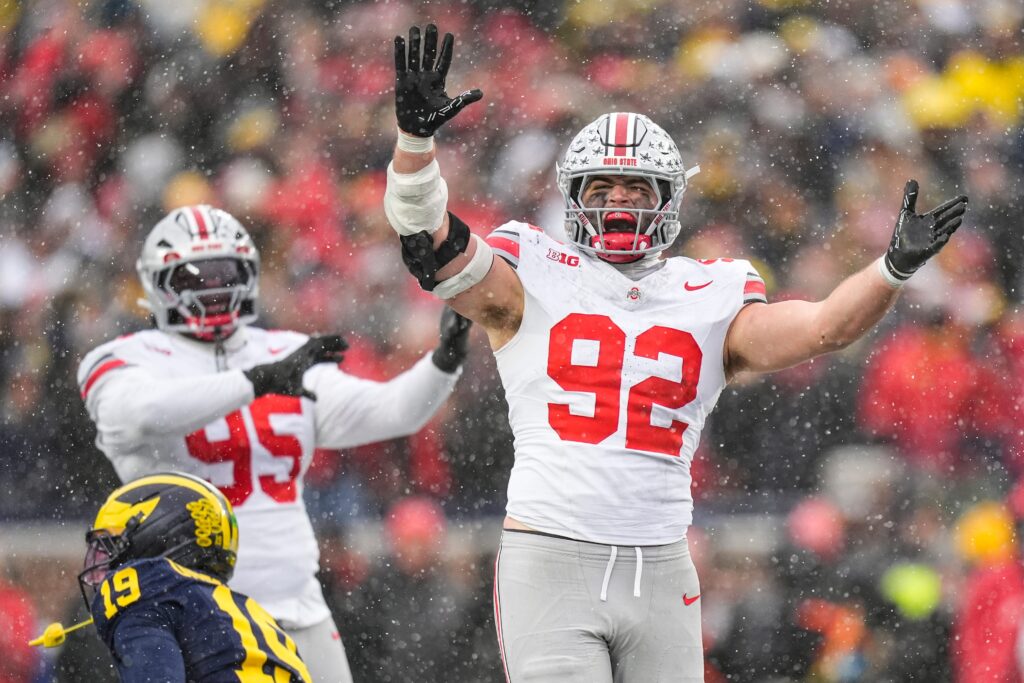 Ohio State EDGE Caden Curry (92) celebrates after making a play vs. Michigan. by Junfu Han-Imagn.com, LLC.